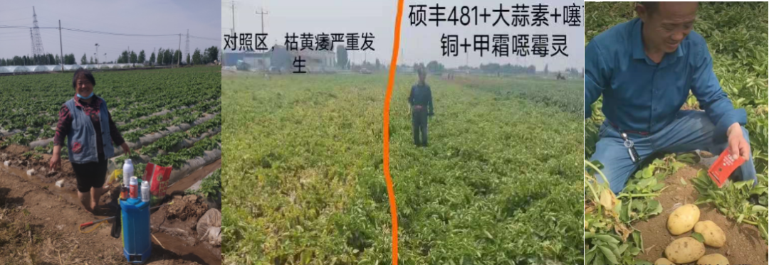 競雙500倍+碩豐481+噻霉酮+甲霜惡霉靈防治土豆枯黃萎病1個月后,土豆健康生長,葉片厚綠,死苗少。