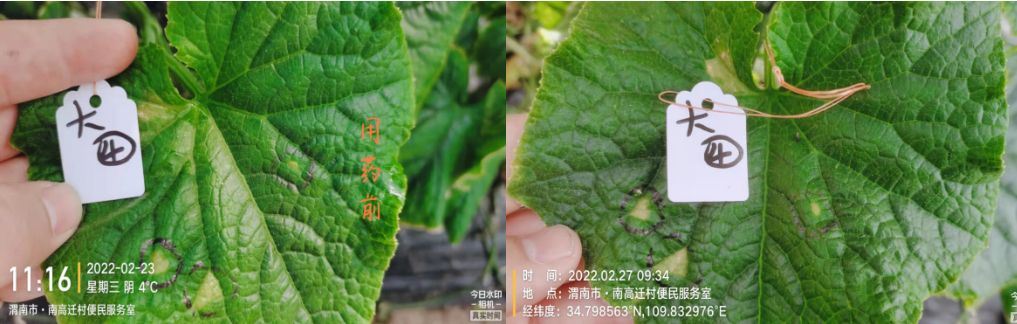 競雙750倍+2%春雷霉素750倍防治黃瓜細菌性角斑病,4條后病斑得到抑制未見擴散。